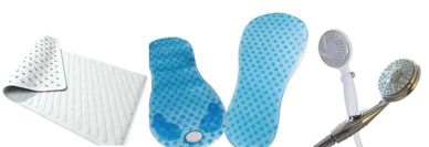 Selection of bath mats including stylish bath mat shaped to fit perfectly with bath seats and transfer benches. Bath Mat provides a slip-resistant, safe surface while showering or bathing. Hand held massage shower heads.